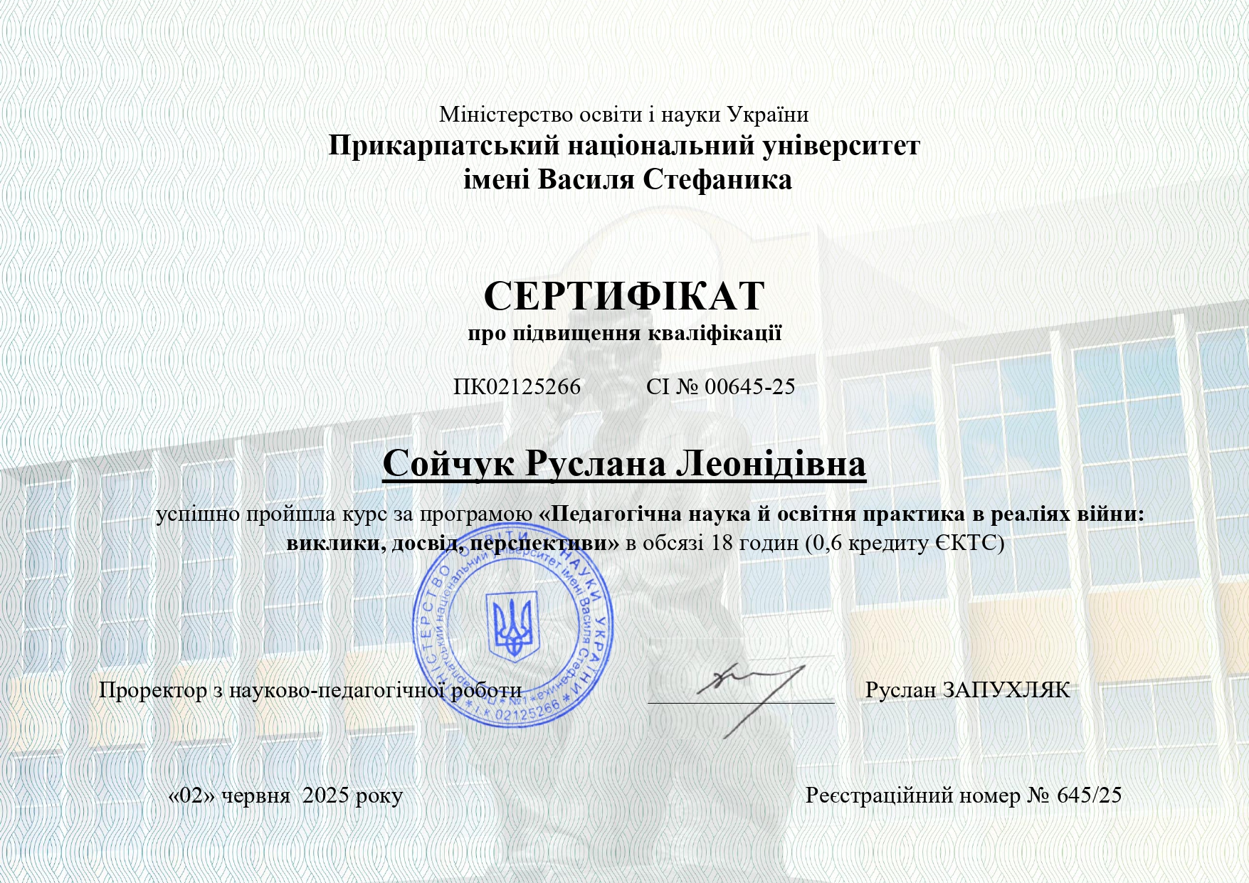 - Підвищення кваліфікації за програмою "Педагогічна наука й освітня практика в реаліях війни: виклики, досвід, перспективи". Сертифікат на 18 год. / 0,6 кред.) №02125266 СІ №00645-25, виданий 02.06.2025.