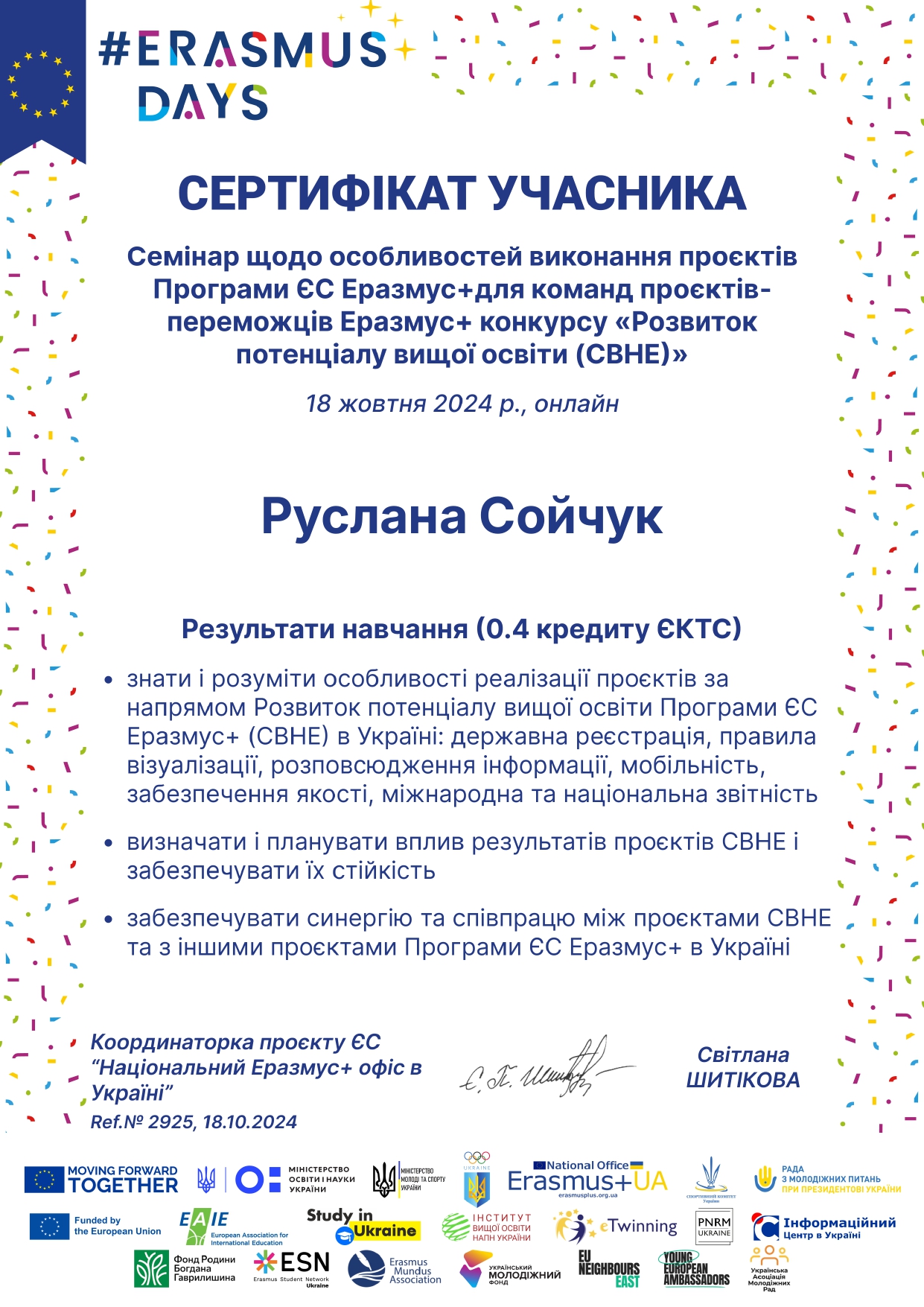 « Особливості реалізації проек тів програми ЄС Erasmus+ під час воєнного стану в Україні » (06.03.2025 Сертифік ат № 2953, Національний офіс Erasmus+ в Україні (Проект ЄС) ). -