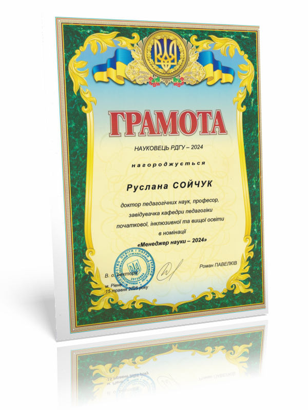 Грамота Департаменту освіти і науки Рівненської обласної державної адміністрації (2024).