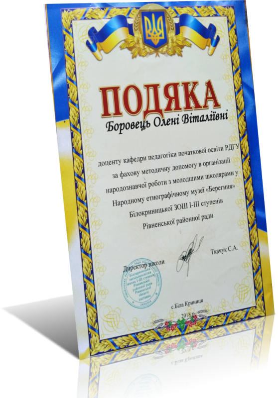 - Стажування (підвищення кваліфікації) на кафедрі педагогіки, психології та корекційної освіти РОІППО (02-31.05. 2018 р.) (Довідка № 01-16 / 597 від 31.05.2018 р.).
