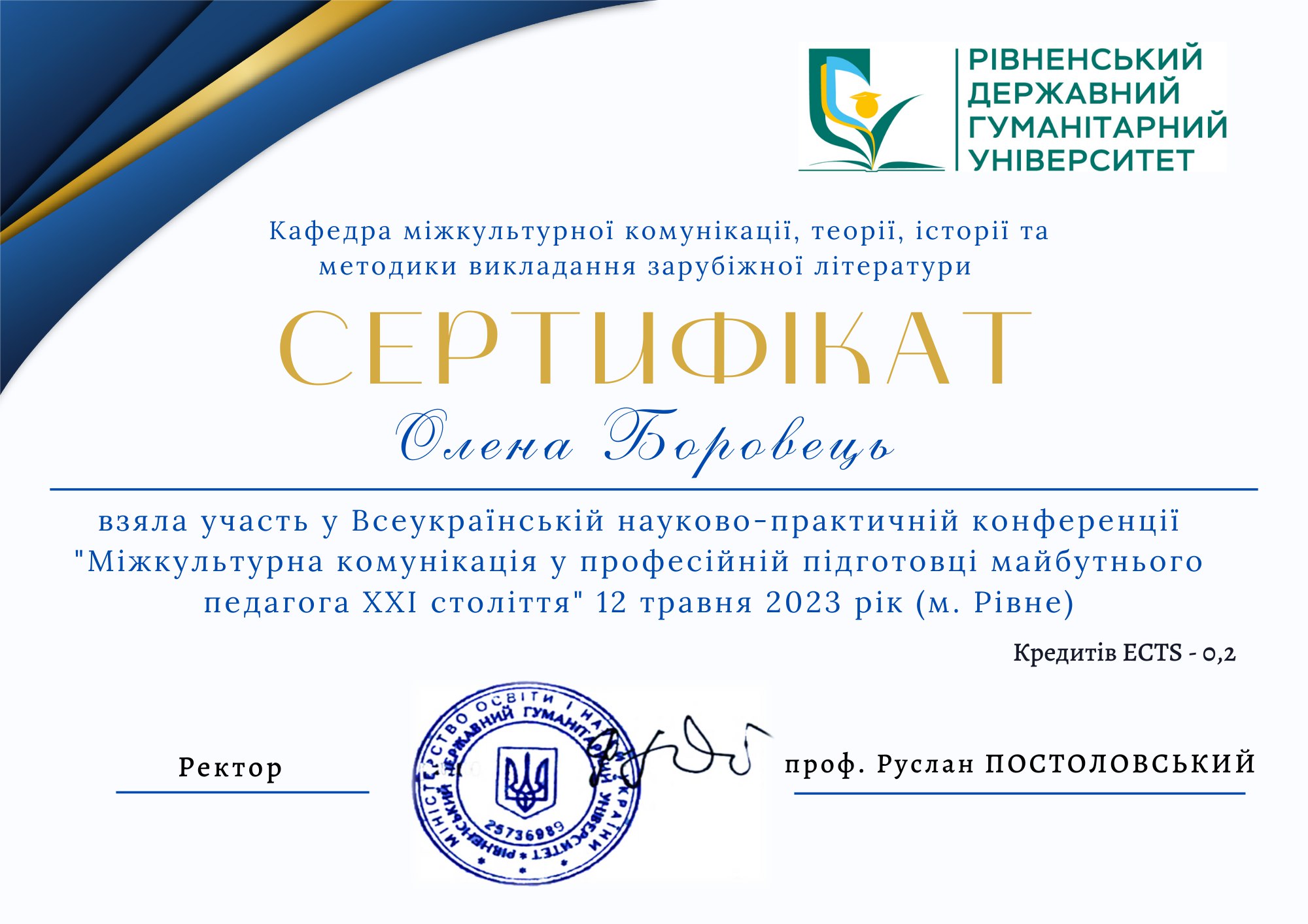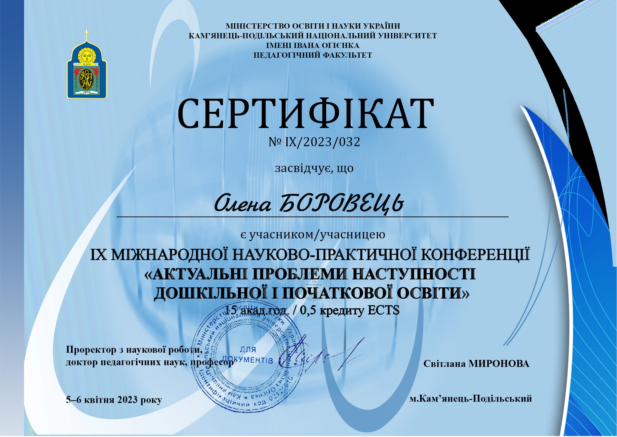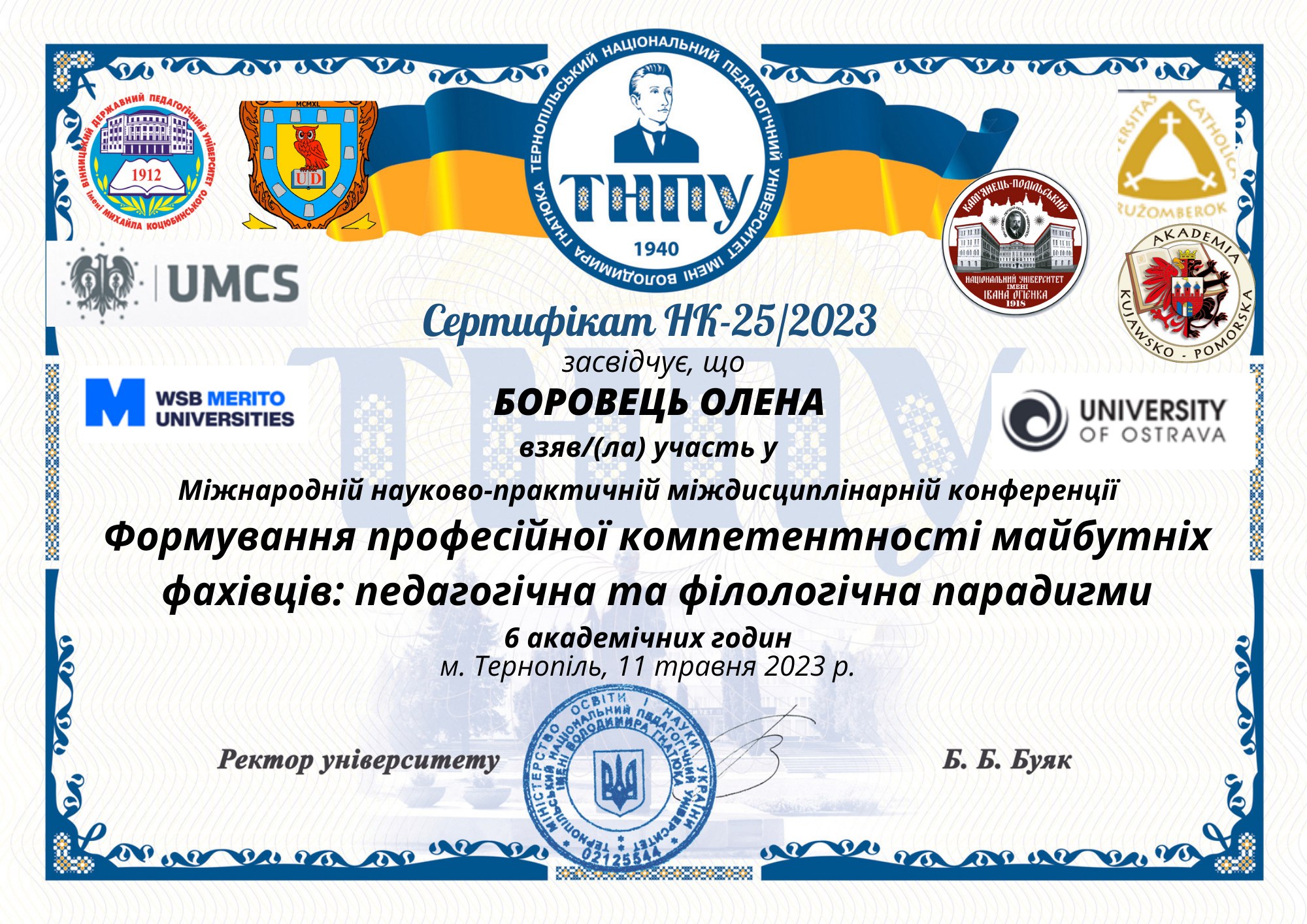- Міжнародне підвищення кваліфікації «Інтерактивні технології змішаного навчання при підготовці бакалаврів та магістрів в країнах Європейського Союзу та Україні»» (вебінар, 06-13. 03.2023 р., м. Люблін, Польська республіка). Обсяг – 45 год., 1,5 кр. ЄКТС. Сертифікат № 12626 від 03.2023 р.