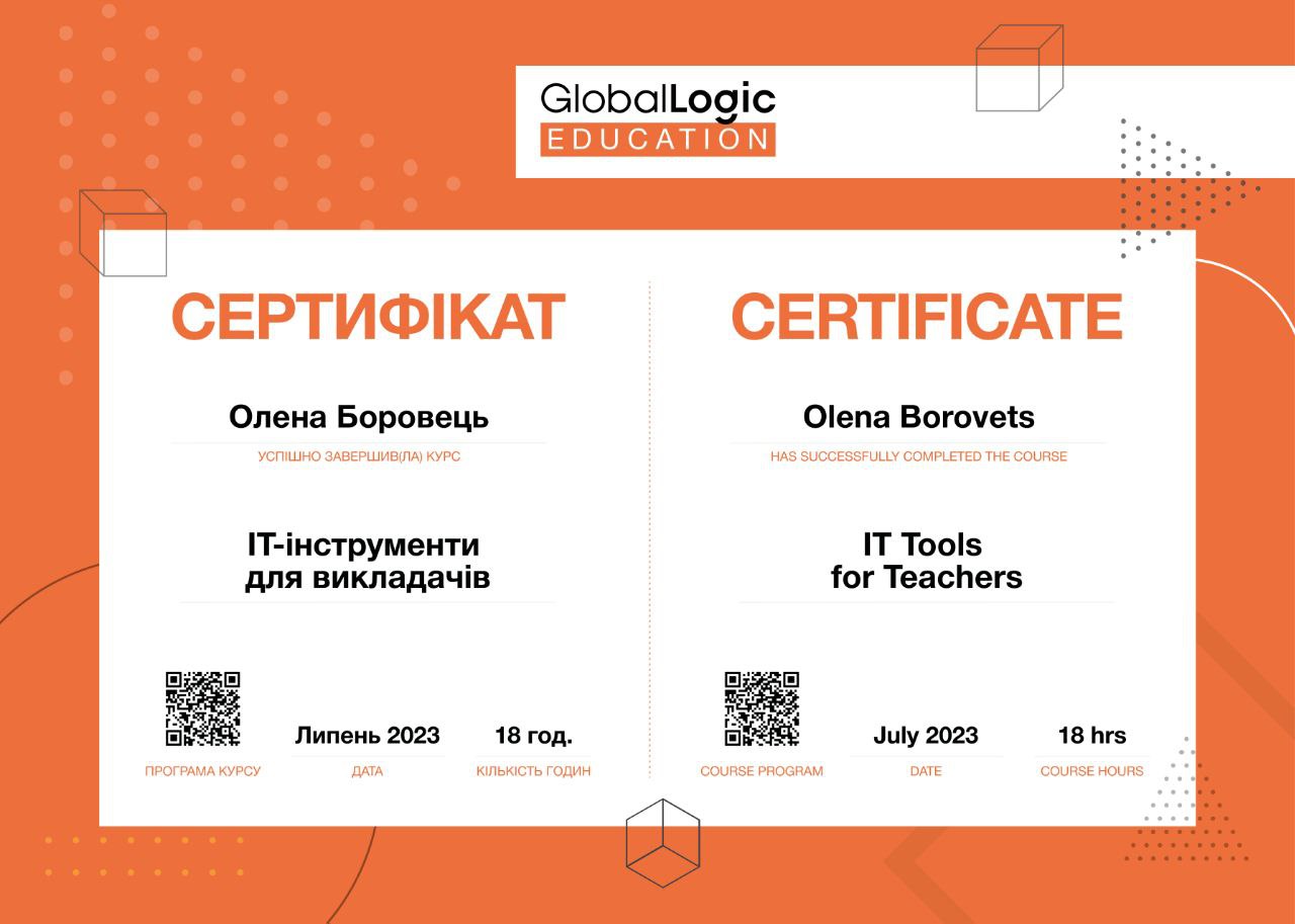- Курс для викладачів від GlobalLogic Education «ІТ-інструменти для викладачів» (липень 2023 р., обсяг – 18 год.)