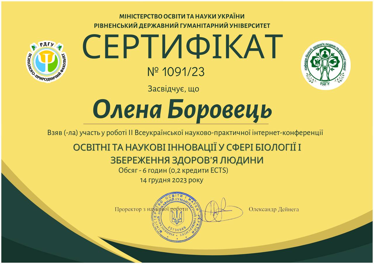 - Підвищення кваліфікації за програмою Всеукраїнського методологічного семінару «Взаємозв’язок НУШ та програми Президента України «Здорова Україна». Обсяг – 3 год., 0,1 кр. ЄКТС. Сертифікат ПК-ФК-2023/918 від 02.2023 р.