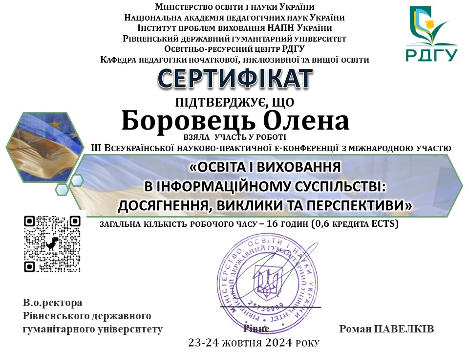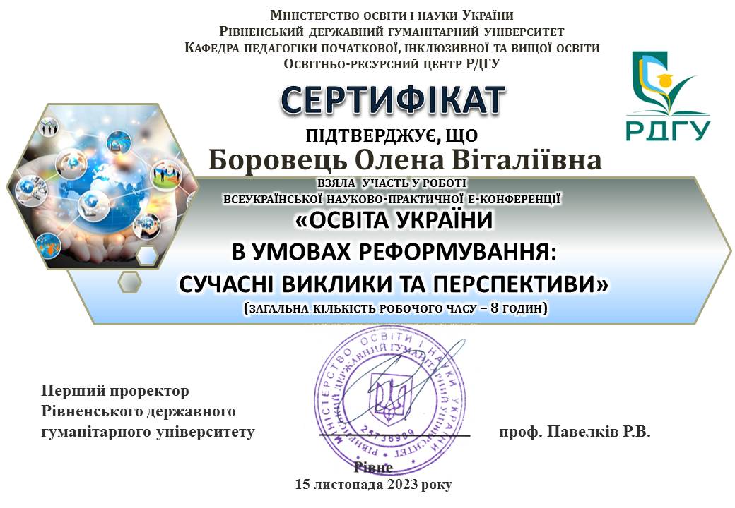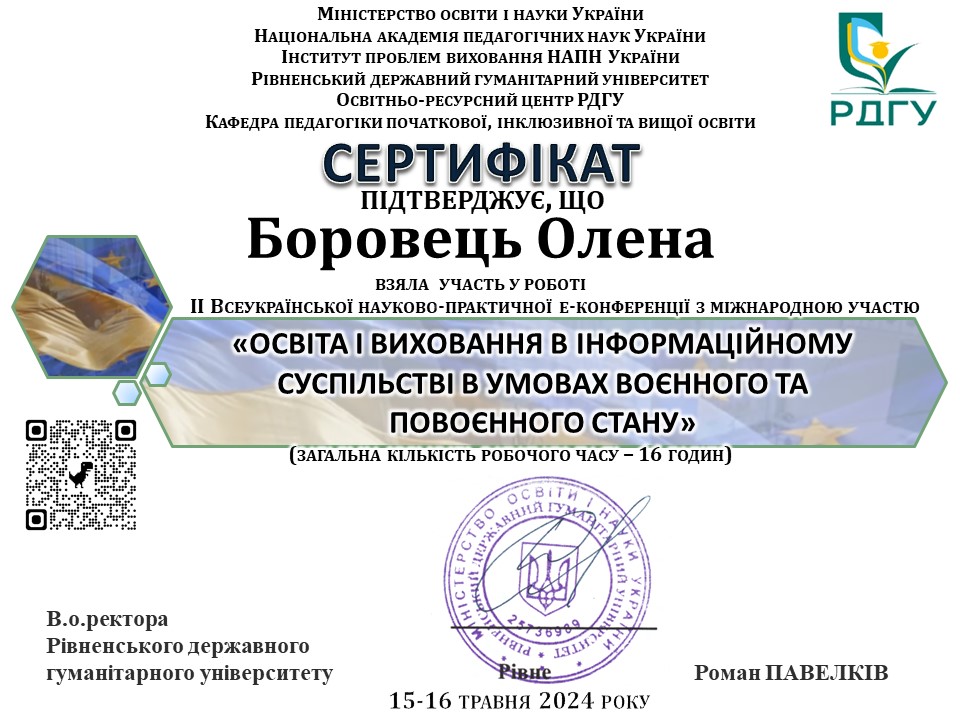 - Підвищення кваліфікації на Українській автентичній платформі «ВІП. ОСВІТА» з теми: Базові елементи та інтегровані компоненти в макроструктурі уроку в інклюзивному класі (психолого-педагогічні аспекти). Спікер – Дмитро Прасол. (Сертифікат № УІК-3272024 від 25 березня 2024 р.) – 2 год./ 0,6 кред.