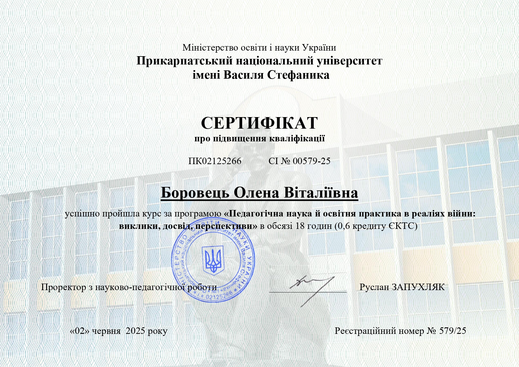 - Підвищення кваліфікації за програмою "Педагогічна наука й освітня практика в реаліях війни: виклики, досвід, перспективи". Сертифікат на 18 год. / 0,6 кред.) №02125266 СІ №00579-25, виданий 02.06.2025.