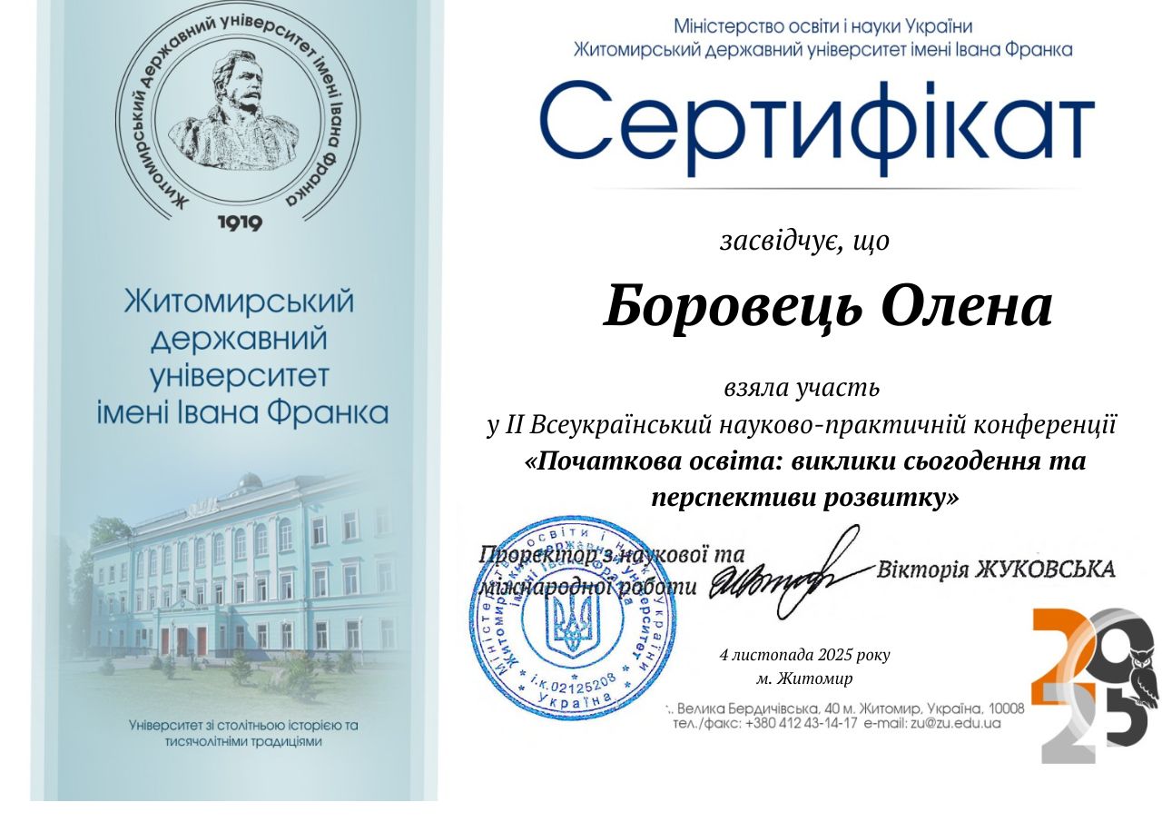 Боровець О. В., Третяк О. М. Підготовка майбутніх учителів до реалізації діяльнісного підходу на уроках у початковій школі. Науковий вісник Південноукраїнського національного педагогічного університету імені К. Д. Ушинського. Випуск 1 (150). Одеса, 2025. С. 71-76.