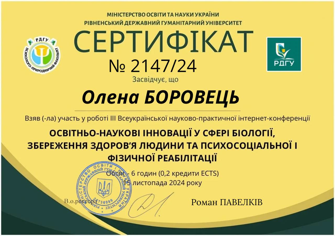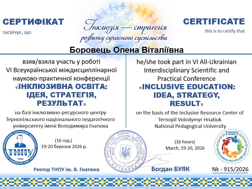 - Підвищення кваліфікації на Українській автентичній платформі «ВІП. ОСВІТА» з теми: Практичні аспекти реалізації інклюзивного навчання для здобувачів освіти з особливими освітніми потребами). Спікер – Дмитро Прасол. (Сертифікат № РІН-2992024 від 01 березня 2024 р.) – 2 год./ 0,6 кред.