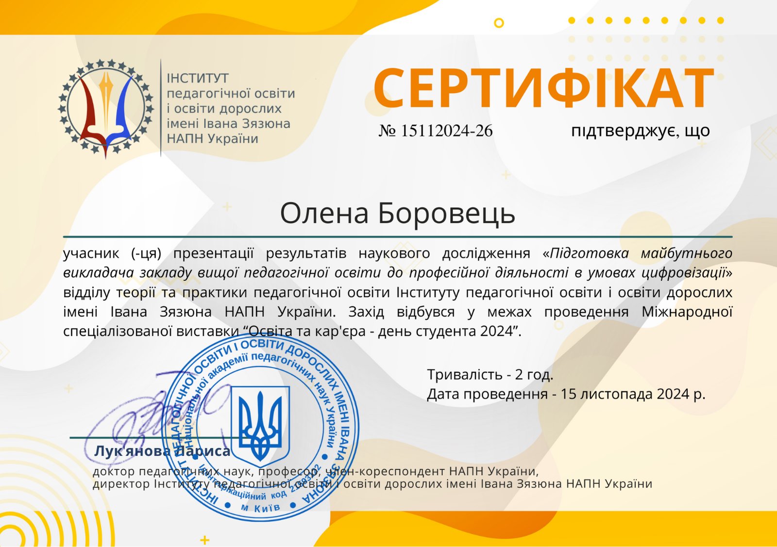 - Підвищення кваліфікації (стажування) у Вищій школі Уні-Терра у Познані (Республіка Польща) на тему: Підвищення професійної компетентності педагога в умовах європейського закладу освіти (Сертифікат No. 33/24 від 12.06.2024 р.) – 180 год., 6 кред.
