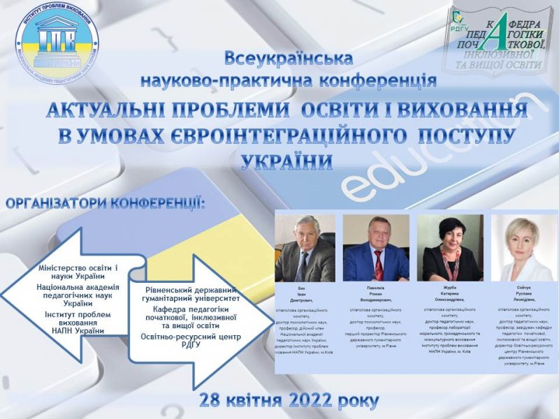 28 квітня 2022 року відбулася Всеукраїнська науково-практична конференція «АКТУАЛЬНІ ПРОБЛЕМИ ОСВІТИ І ВИХОВАННЯ В УМОВАХ ЄВРОІНТЕГРАЦІЙНОГО ПОСТУПУ УКРАЇНИ». Співорганізаторами конференції виступили Інститут проблем виховання НАПН України (лабораторія морального, громадянського та міжкультурного виховання) та Рівненський державний гуманітарний університет (кафедра педагогіки початкової, інклюзивної та вищої освіти, Освітньо-ресурсний центр РДГУ).