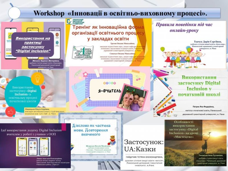 Яскравими, творчими ідеями із власного педагогічного досвіду роботи були сповнені виступи активних учасників заходу Третяк Оксани Миколаївни, кандидата педагогічних наук, доцента кафедри педагогіки початкової, інклюзивної та вищої освіти, Рівненський державний гуманітарний університет, м. Рівне; Синьчук Оксани Миколаївни, кандидата педагогічних наук, доцента кафедри педагогіки початкової, інклюзивної та вищої освіти, Рівненський державний гуманітарний університет, м. Рівне; Раджабової Тетяни Миколаївни, вчителя вищої кваліфікаційної категорії, Рівненська загальноосвітня школа І-ІІІ ступенів №8 Рівненської міської ради, м. Рівне; Ляшик Анастасії Олександрівни, вчителя-логопеда опорного закладу Прислуцький ліцей Березнівської міської ради Рівненського району, с. Прислуч; Ляшецької Ольги Ігорівни, викладача англійської мови у студії вивчення іноземних мов "Let's Talk", м. Рівне та здобувачі вищої освіти Рівненського державного гуманітарного університету.