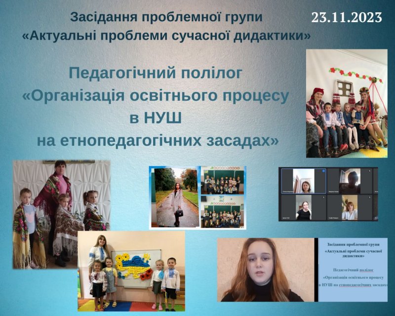 23 листопада 2023 року відбулося розширене засідання проблемної групи «Актуальні проблеми сучасної дидактики» (керівник доц. Боровець О. В.) у форматі педагогічного полілогу «Організація освітнього процесу в НУШ на етнопедагогічних засадах».