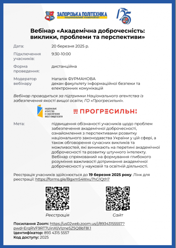 20 березня 2025 р. відбувся вебінар «Академічна доброчесність: виклики, проблеми та перспективи – 2025», який пройшов в онлайн-форматі за ініціативи колег з Національний університет «Запорізька політехніка». Вебінар проводився за підтримки Національного агентства забезпечення якості вищої освіти, ГО «Прогресильні».