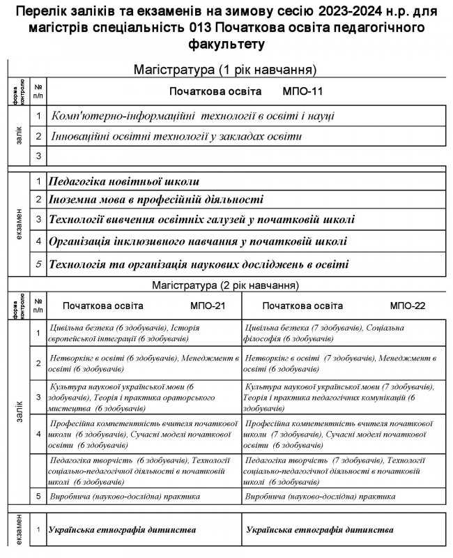 Перелік заліків та екзаменів на зимову сесію 2023-2024 н.р. для магістрів спеціальності 013 Початкова освіта