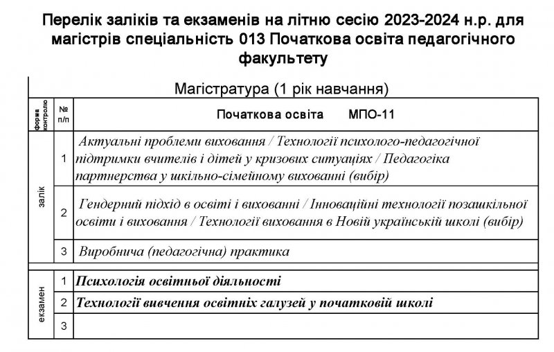 Перелік заліків та екзаменів на літню сесію 2023-2024 н.р. для магістрів спеціальності 013 Початкова освіта