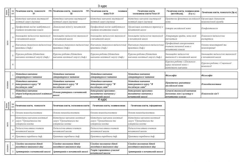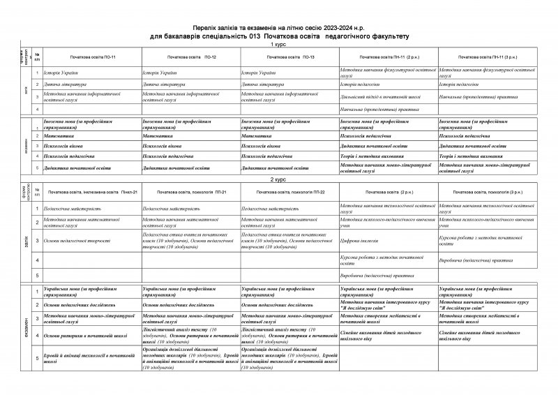 Перелік заліків та екзаменів на літню сесію 2023-2024 н.р. для бакалаврів спеціальності 013 Початкова освіта