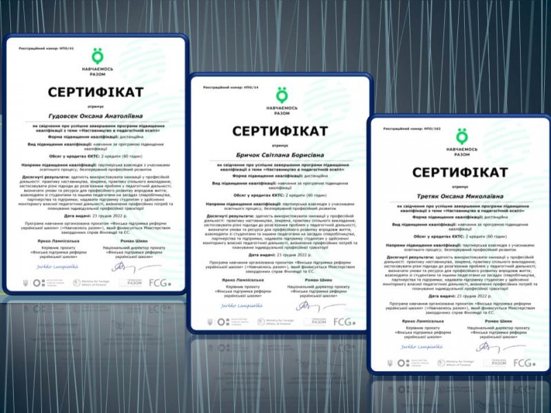 Проф. Оксана Анатоліївна Гудовсек, доц. Світлана Борисівна Бричок та доц. Оксана Миколаївна Третяк з 17 жовтня по 15 грудня 2022 р.взяли участь у 15 вебінарах «Наставництво в педагогічній практиці» для ЗВО в межах Міжнародної програми «Вища школа» проєкту «Фінська підтримка реформи української школи» («Навчаємось разом»)