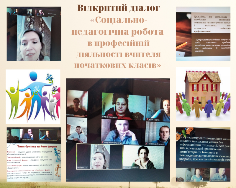 27 жовтня 2022 року в межах вивчення курсу «Основи соціально-педагогічної роботи в початковій школі» проведено відкритий діалог «Соціально-педагогічна робота в професійній діяльності вчителя початкових класів» (викладач доц. Боровець Олена Віталіївна). Здобувачі вищої освіти педагогічного факультету групи ПІнклІнф-31 презентували проєкти соціально-педагогічних профілактичних заходів для дітей молодшого шкільного віку, активно включилися в обговорення дискусійних питань, брали участь в інтерактивних вправах, аналізували педагогічні ситуації. До розгляду актуальних соціально-педагогічних проблем долучилася керівник Центру «Студентська соціальна служба» РДГУ Рибак Вікторія Аркадіївна. На завершення учасники відкритого діалогу зробили висновки про важливе значення ефективної реалізації соціально-педагогічної функції професійної діяльності вчителя сучасної початкової школи.