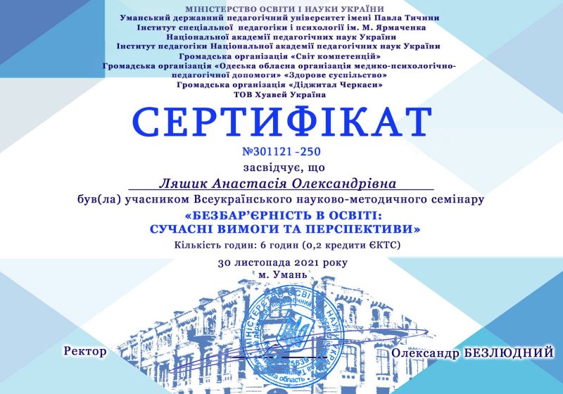 30 листопада 2021 року на базі факультету фізики, математики та інформатики Уманського державного педагогічного університету імені Павла Тичини відбувся Всеукраїнський науково-методичний семінар «Безбар'єрність в освіті: сучасні вимоги та перспективи».