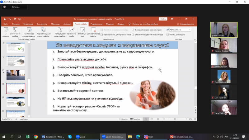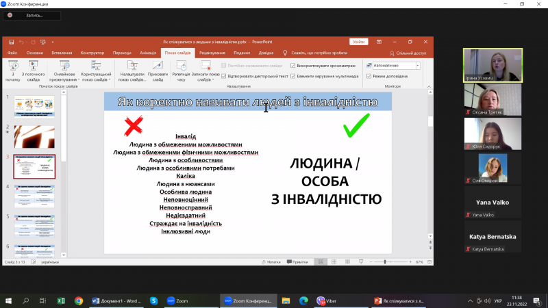 23.11.2022 р. проведено гостьову лекцію з Основ інклюзивної педагогіки. Лектор - пані Ірина Усович, завідувачка відділом соціокультурної діяльності Рівненської ОУНБ, представила здобувачам вищої освіти педагогічного факультету спеціальності Початкова освіта (2, 3 курси) лекцію на тему: «Руйнуємо стереотипи про людей з інвалідністю: як спілкуватися і що важливо знати». Пані Ірина наголосила на термінології, яку не варто вживати стосовно людей з інвалідністю; продемонструвала відеоролики. Під час лекції говорили про основні принципи етикету в спілкуванні з людьми з інвалідністю, вчилися коректно називати людей з інвалідністю, розширювали словниковий запас, розглядали ситуації поведінки з людьми з порушеннями зору, слуху, що пересуваються на кріслах колісних та ментальними порушеннями.