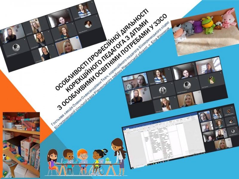 Олена Олександрівна під час заняття вибудувала зі здобувачами вищої освіти зворотній зв’язок, опиралася на їхні знання. Лектор поділилася досвідом роботи корекційного педагога з дітьми з особливими освітніми потребами, продемонструвала форми та методи роботи під час корекційного заняття; ознайомила слухачів з документацією, яка ведеться корекційним педагогом, та провела онлайн-огляд кабінету, де проходять корекційні заняття з учнями з особливими освітніми потребами.