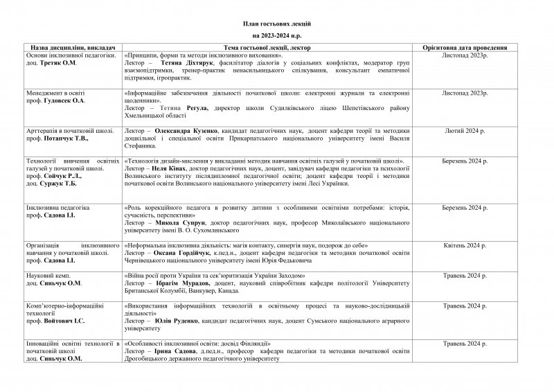 План проведення гостьових лекцій на 2023-2024 навчальний рік