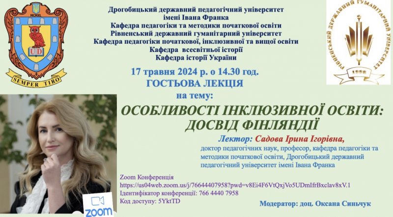 17 травня 2024 року о 14-30 запрошуємо на гостьову лекцію доктора педагогічних наук, професора Садової Ірини Ігорівни. Тема лекції: Особливості інклюзивної освіти: досвід Фінляндії