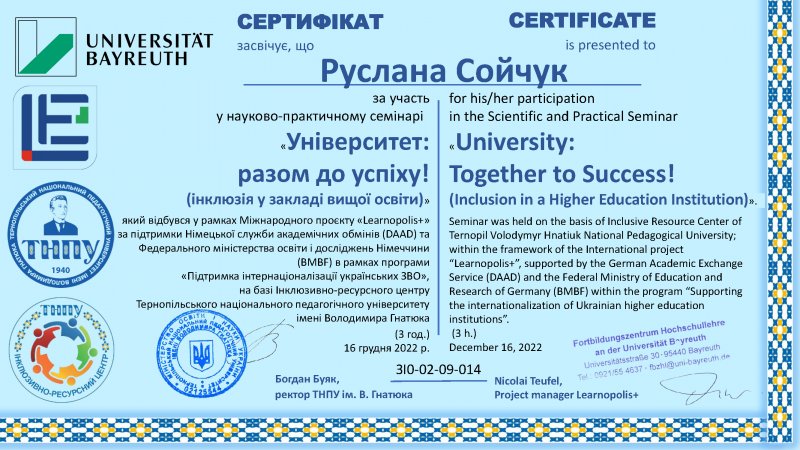 Проф. Руслана Леонідівна Сойчук взяла активну участь у роботі науково-практичного семінару «Університет: разом до успіху! (інклюзія у закладі вищої освіти)», який відбувся у рамках Міжнародного проєкту «Learnopolis+» за підтримки Німецької служби академічних обмінів (DAAD) та Федерального міністерства освіти і досліджень Німеччини (BMBF) в рамках програми «Підтримка інтернаціоналізації українських ЗВО», на базі Інклюзивно-ресурсного центру Тернопільського національного педагогічного університету імені Володимира Гнатюка