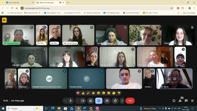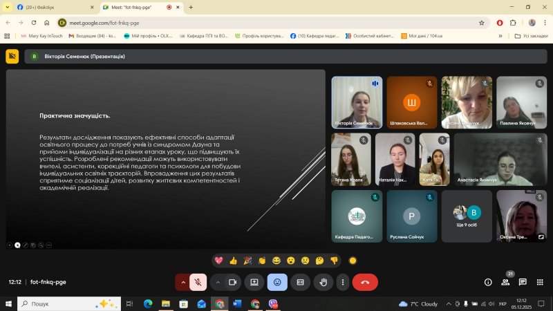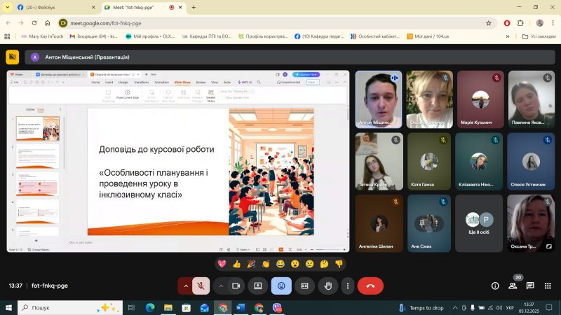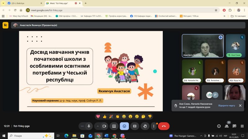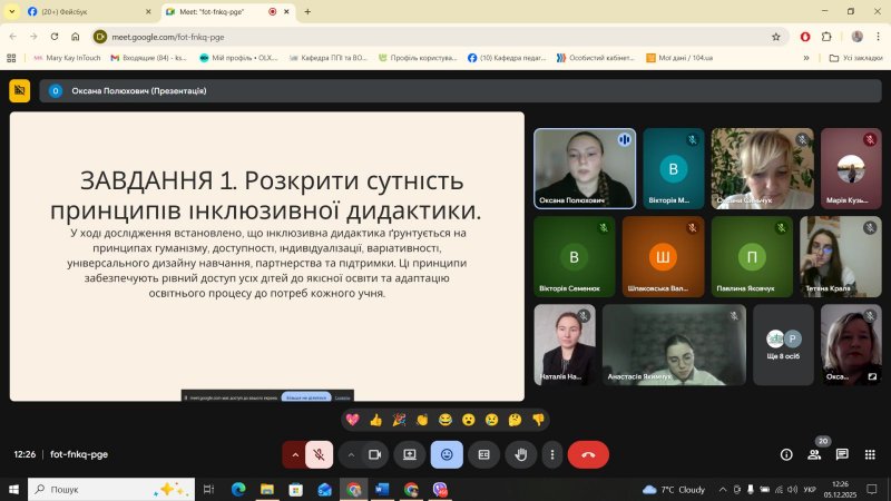 5 грудня 2025 року на кафедрі педагогіки початкової, інклюзивної та вищої освіти відбулися захисти курсових робіт з «Дидактики інклюзивного навчання» здобувачів першого (бакалаврського) рівня вищої освіти спеціальності 013 Початкова освіта за освітньо-професійною програмою «Початкова освіта, інклюзивна освіта», груп Пінкл-41 (14 здобувачів) та ПН-31 (3 здобувачі). Комісія працювала у такому складі: завідувач кафедри педагогічки початкової, інклюзивної та вищої освіти, професор Руслана СОЙЧУК доценти Оксана СИНЬЧУК та Оксана ТРЕТЯК.