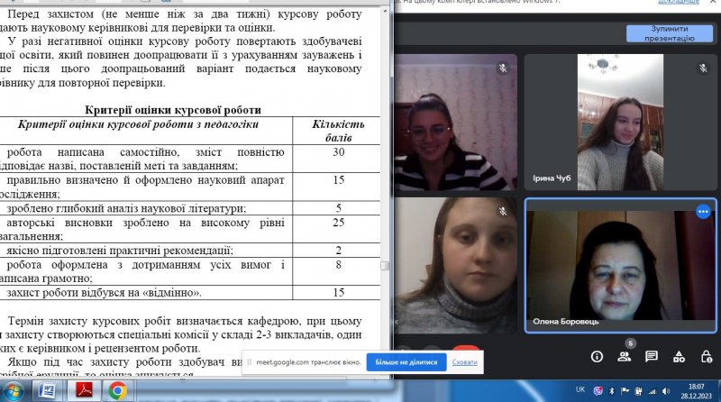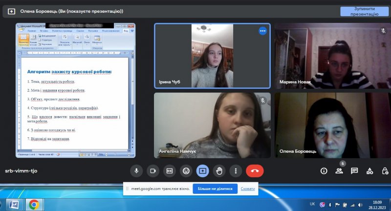 Під час захистів курсових робіт, які відбулися 28 та 29 грудня 2023 р., здобувачі вищої освіти аргументували актуальність тем, розкрили основний зміст досліджень, схарактеризували висновки та пропозиції, відповідали на запитання. Комісія із захисту курсових робіт відзначила як найгрунтовніші та найсистемніші роботи Чуб Ірини (група ПН-21), Островської Наталії та Валько Яни (група ПІнкл-31).