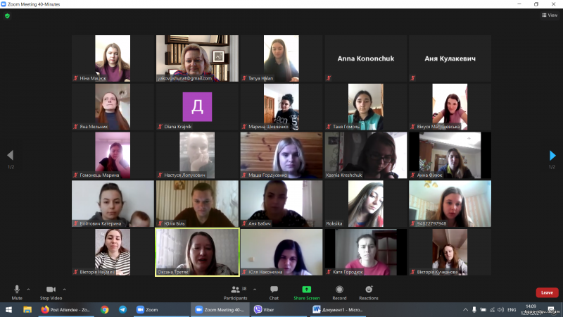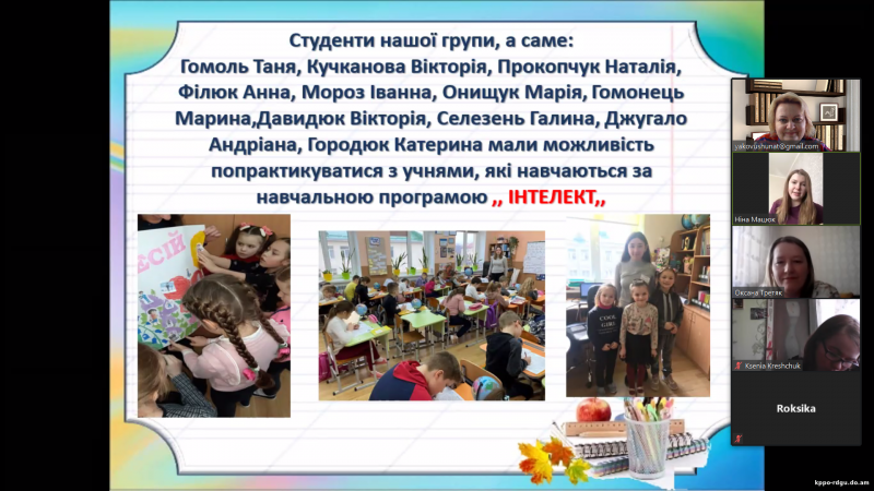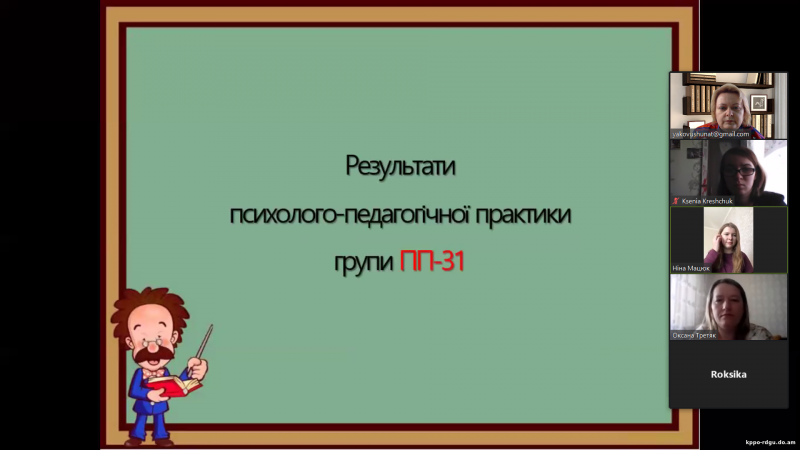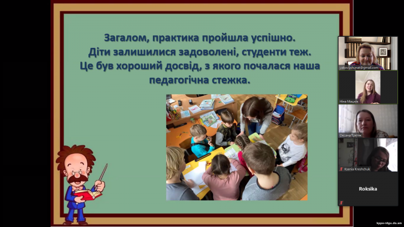 Відбулася підсумкова онлайн-конференція з навчальної (психолого-педагогічної) практики здобувачів 3 курсу педагогічного факультету. Студенти проходили практику на базі двох навчально-виховних комплексів Рівного: НВК «Загальноосвітній навчальний заклад І-ІІІ ступенів – дошкільний навчальний заклад №14» та НВК «Загальноосвітня школаI-III ступенів – спеціалізована спортивна школа №26». Групові керівники проф. Р.Л. Сойчук та доц. Т.В. Яковишина повідомили, що мету навчальної (психолого-педагогічної) практики було досягнуто, адже всі здобувачі усвідомили: вчителеві треба вміти приносити в клас позитив, життєлюбність; спрямовувати погляд дітей на красу навколишнього середовища, пробуджувати в них натхнення на творчість, задоволення від набутих знань і вмінь, радість від продукування цікавих креативних ідей. І все це з часом має стати складовими мудрого життя порядної людини в соціумі. Таке усвідомлення допомогло нашим практикантам ретельно готуватися до кожного пробного уроку, ранкових зустрічей та інших запланованих заходів.