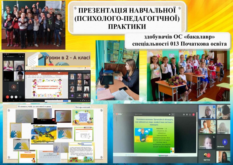 Здобувачі вищої освіти відповідно до наказу проходили навчальну (психолого-педагогічну) практику у закладах загальної середньої освіти м. Рівного, Рівненської та Волинської областей. Під час звітної конференції студенти презентували результати свого першого набуття досвіду професійної діяльності – вчителя початкової школи.