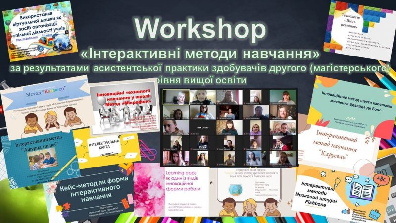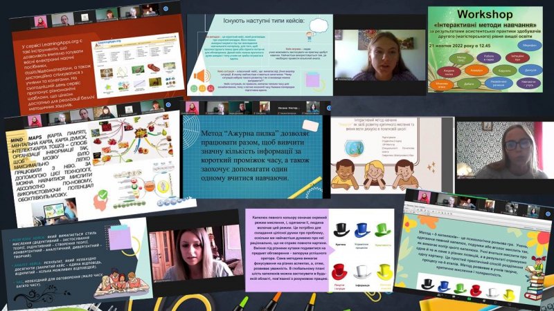 21.10.2022 року кафедрою педагогіки початкової, інклюзивної та вищої освіти Рівненського державного гуманітарного університету організовано та проведено у межах асистентської практики «Workshop» за темою «Інтерактивні методи навчання» (в онлайн форматі на платформі Zoom). Здобувачі другого (магістерського) рівня вищої освіти заочної форми навчання зі спеціальності 013 «Початкова освіта» продемонстрували студентам педагогічного факультету особливості застосування інноваційних форм і методів, технологій із власного досвіду педагогічної діяльності. У заході взяли участь понад 60 здобувачів першого (бакалаврського) і другого (магістерського) рівнів вищої освіти та професорсько-викладацький склад кафедри.