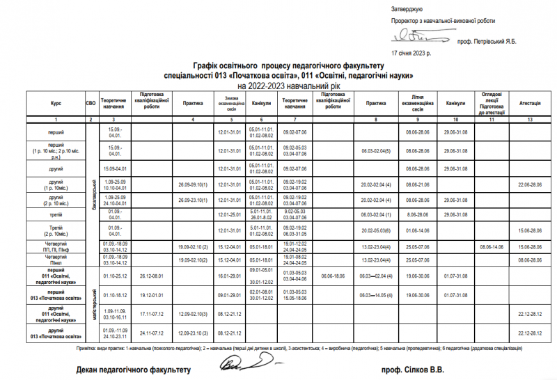 Графік освітнього процесу педагогічного факультету спеціальностей 013 Початкова освіта та 011 Освітні, педагогічні науки на 2022-2023 н.р. (заочної форми навчання)