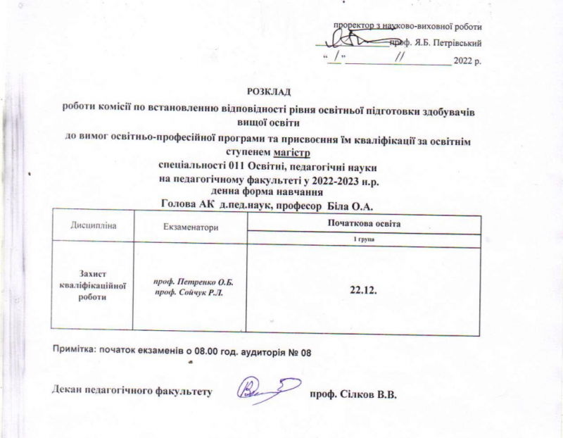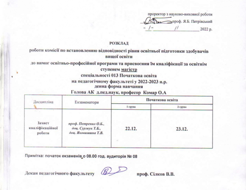 Розклад роботи комісії по встановленню відповідності рівня освітньої підготовки здобувачів вищої освіти до вимог освітньо-професійної програми та присвоєння кваліфікації за освітнім ступенем "магістр"у 2022-2023 н.р.
