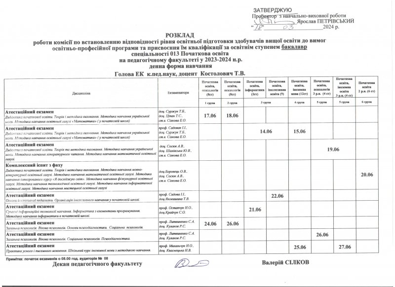 Розклад роботи комісії по встановленню відповідності рівня освітньої підготовки здобувачів вищої освіти до вимог освітньо-професійної програми та присвоєння їм кваліфікації за освітнім ступенем "бакалавр" спеціальності 013 Початкова освіта (денна форма навчання)
