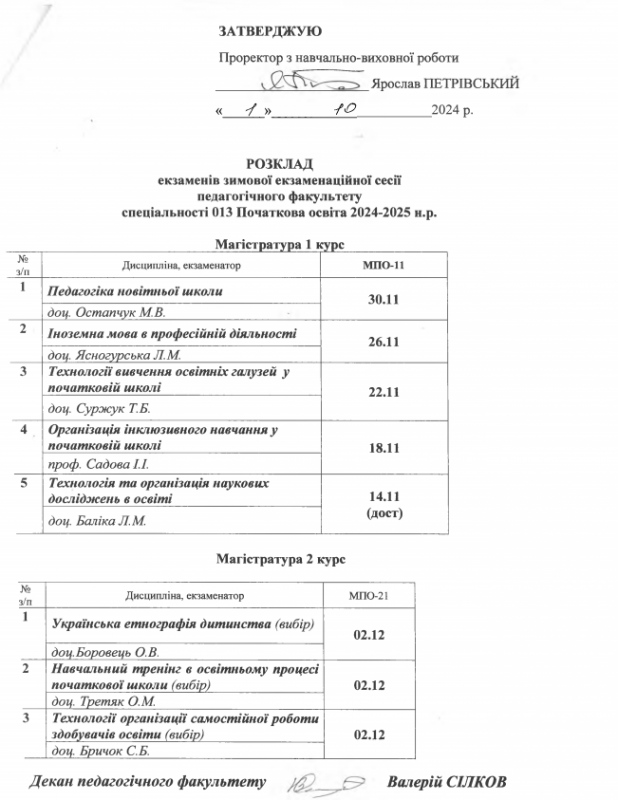 Розклад екзаменів зимової екзаменаційної сесії спеціальності 013 Початкова освіта на 2024-2025 н.р. (магістратура)